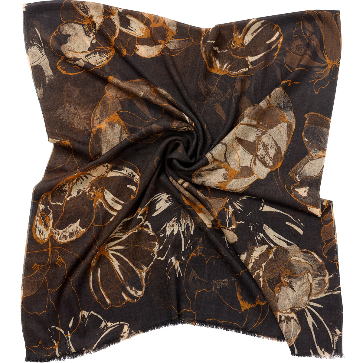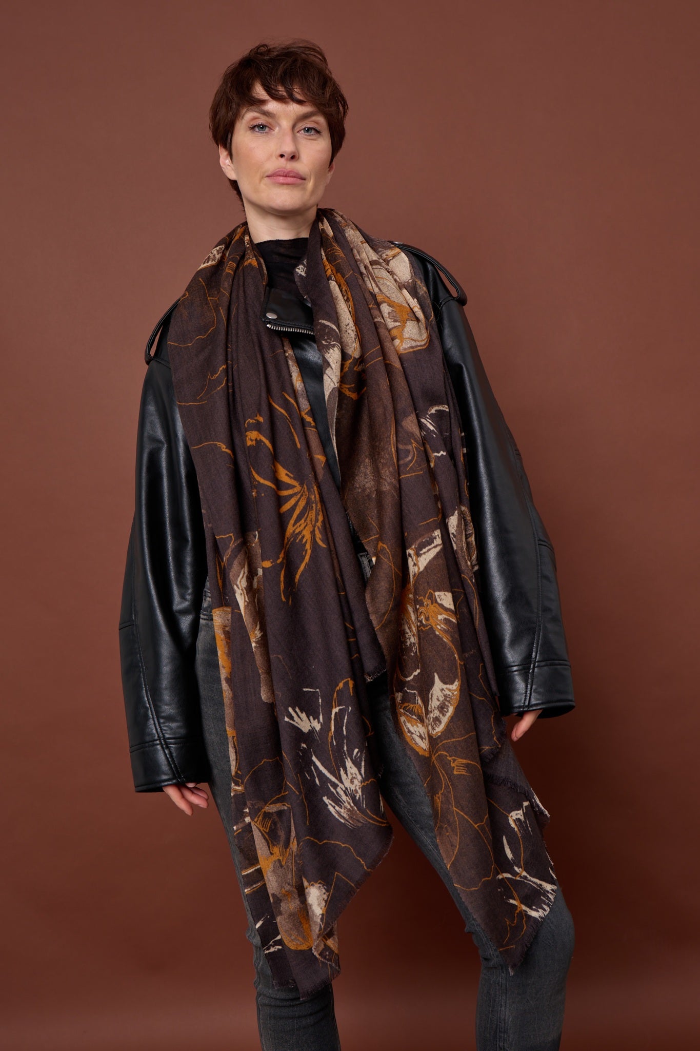 Langer Wollschal mit großem abstraktem Blumenmotiv und rohen Kanten.