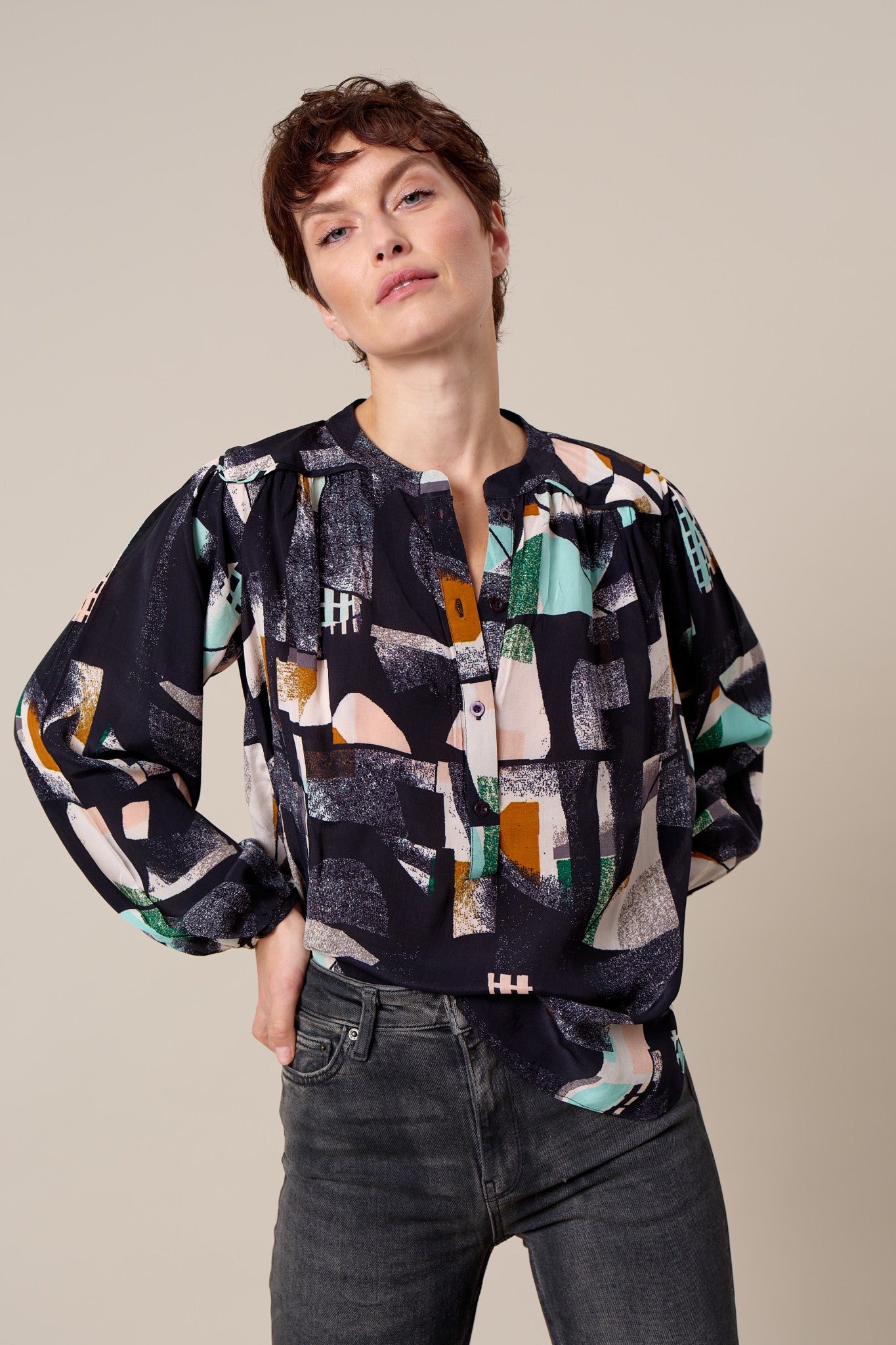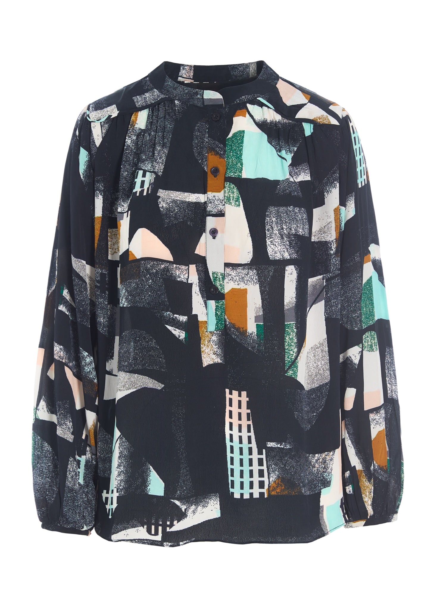 Hemdbluse mit Knopfleiste, Stehkragen und Ballonärmeln in einer weichen, luftigen Viskosequalität mit abstraktem geometrischem Motiv.