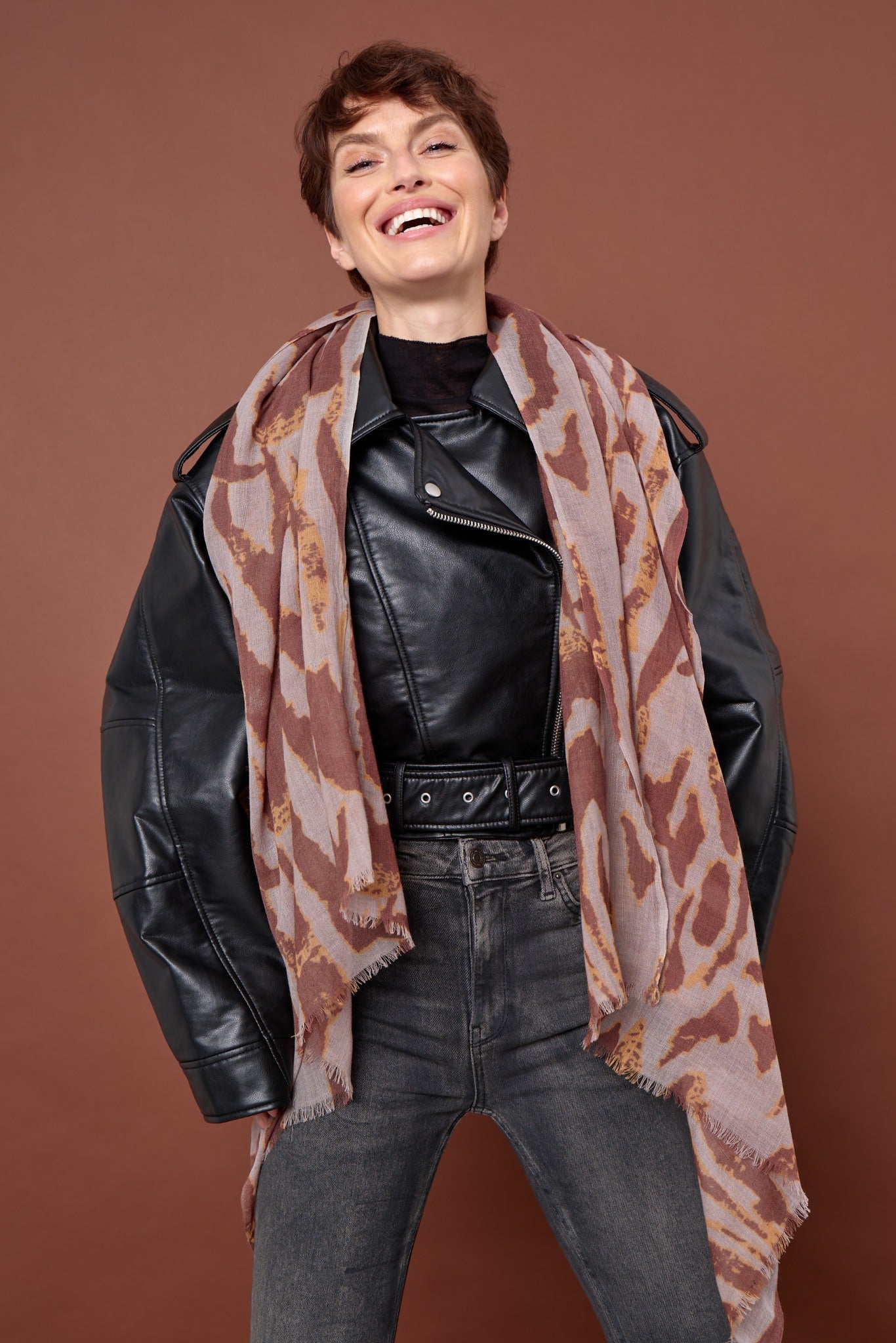 Aflangt Schal i en let, blød og luftig Woll kvalitet med Leo motiv og rå ender.