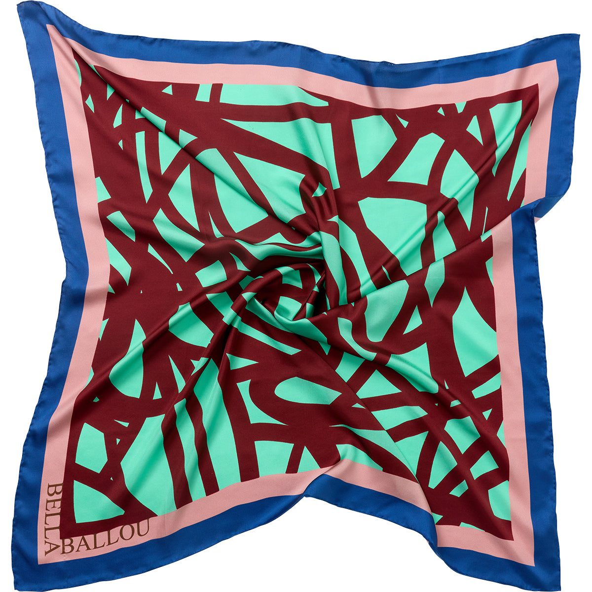 Square Silk scarf with graphic lines, contrast colored edges, and hand-sewn rolled edges.