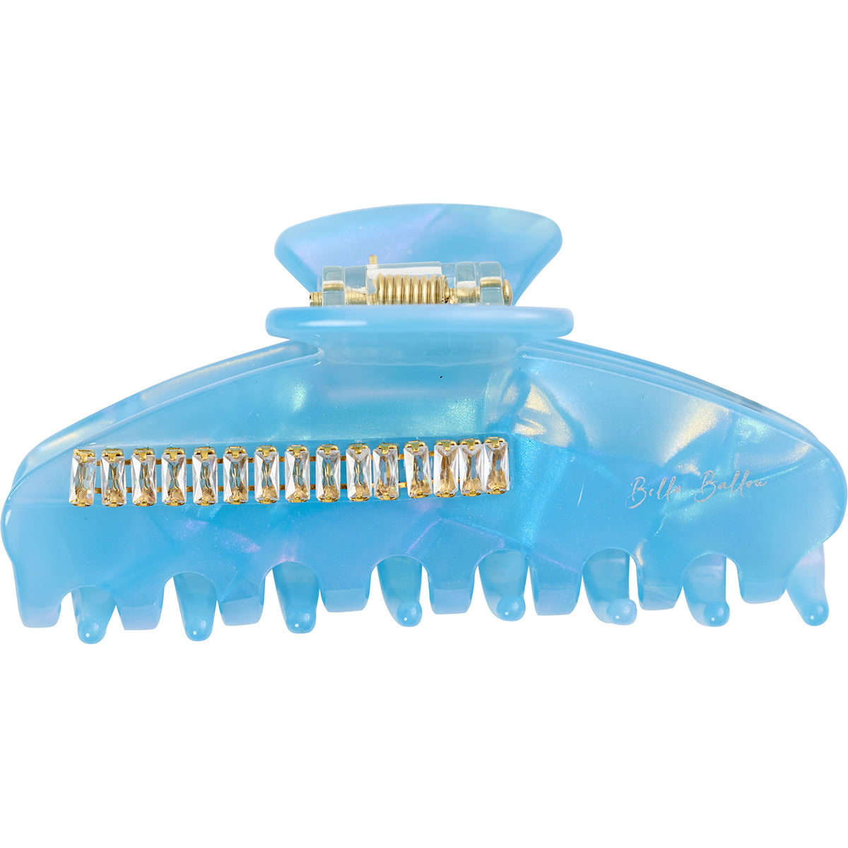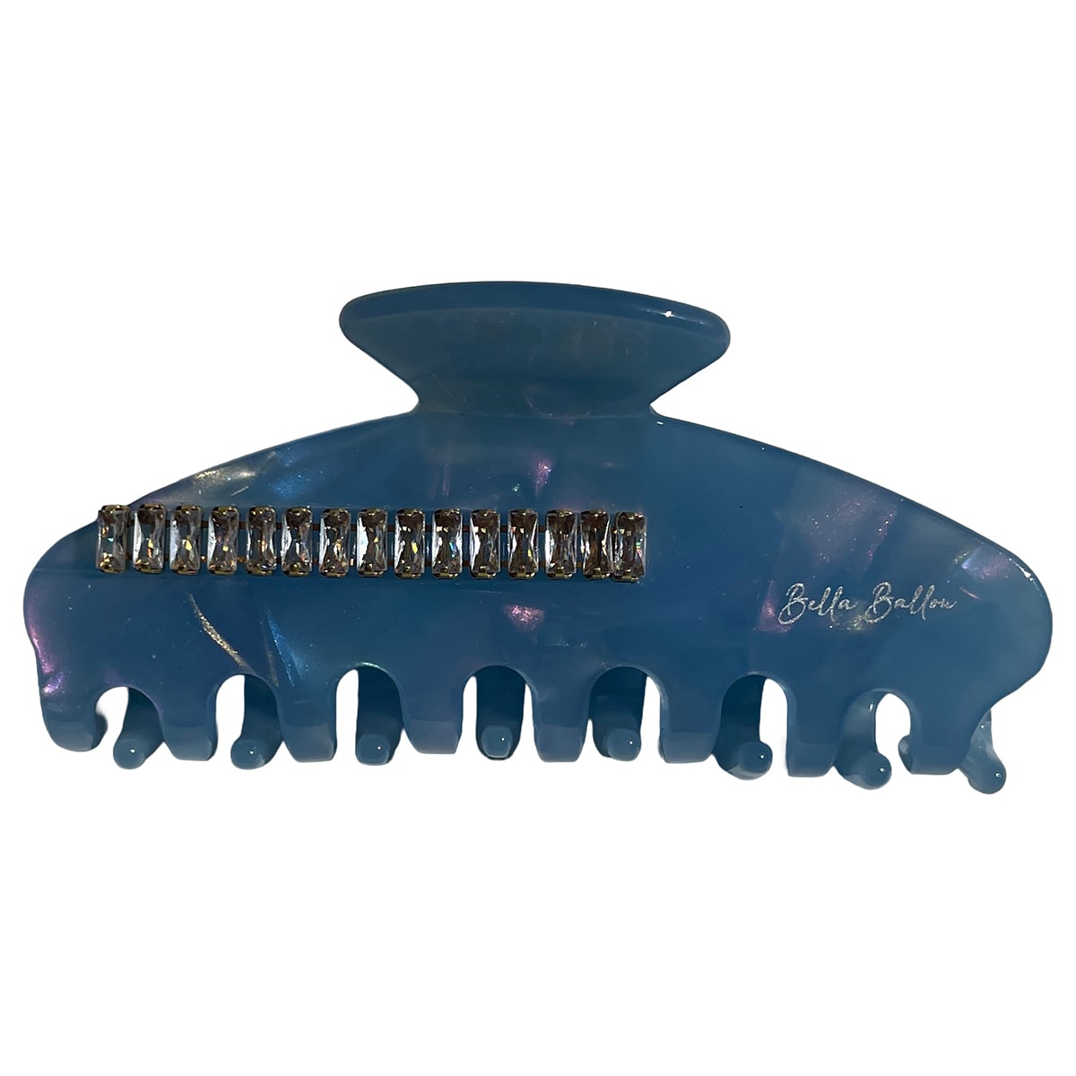Robust hair clip with a row of rhinestones on both sides and silver-colored logo print. Madein environmentally friendly Cellulose Acetate. Fits tight and well in the hair.