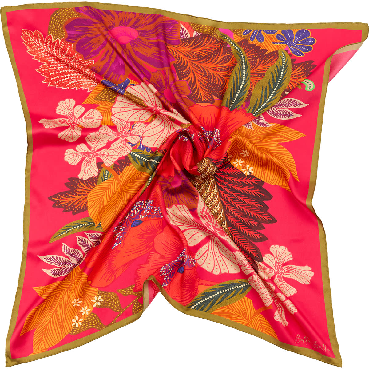 Inspiring golden sunset colors on a collage of beautiful flowers – the square Silk scarf from Christine Headwear x Bella Ballou is the most beautiful accessory for the summer months.