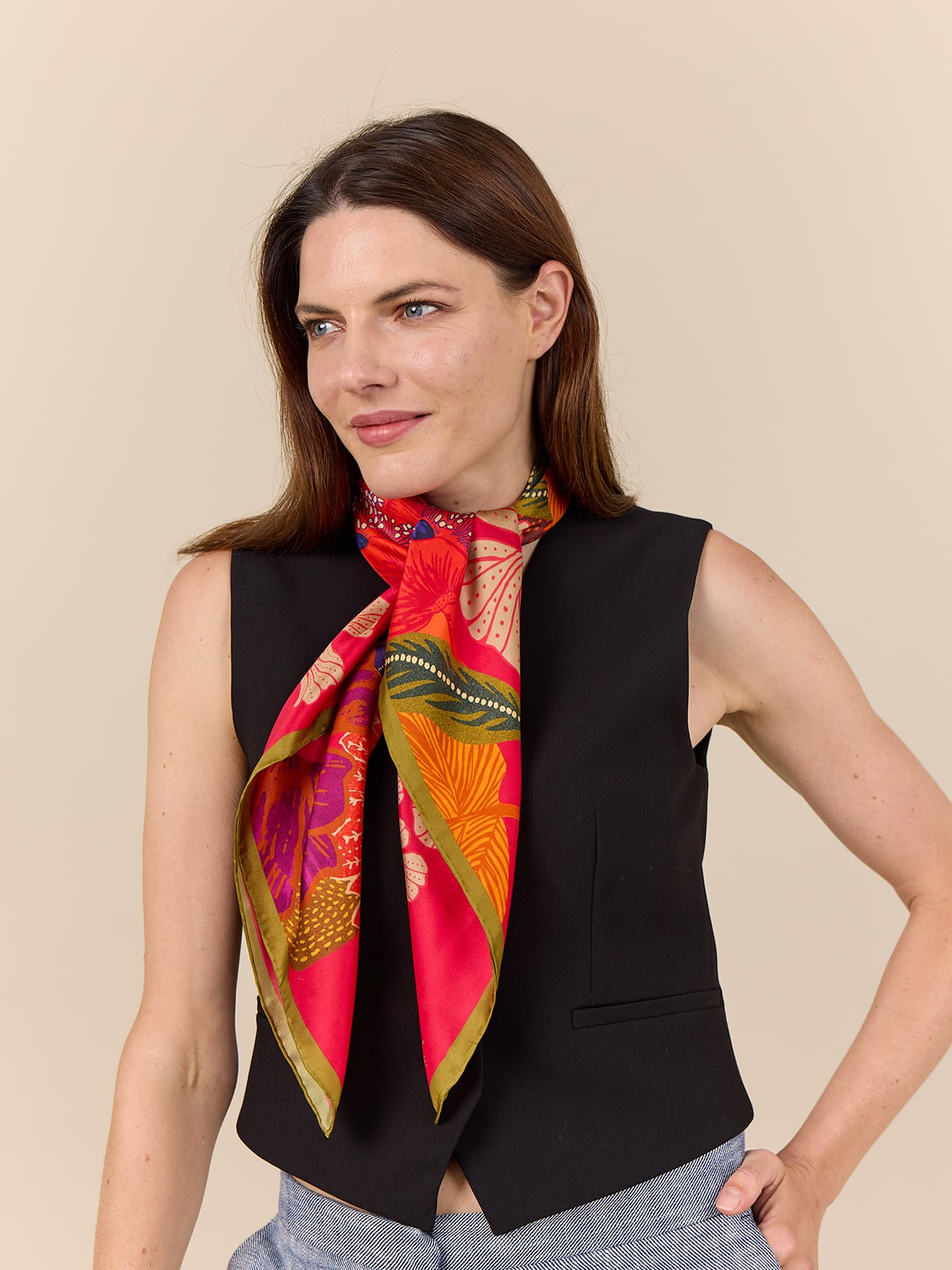 The scarf measures 90x90cm, making it perfect for creative combinations around the neck, over a light jacket, or together with the Milena turban.