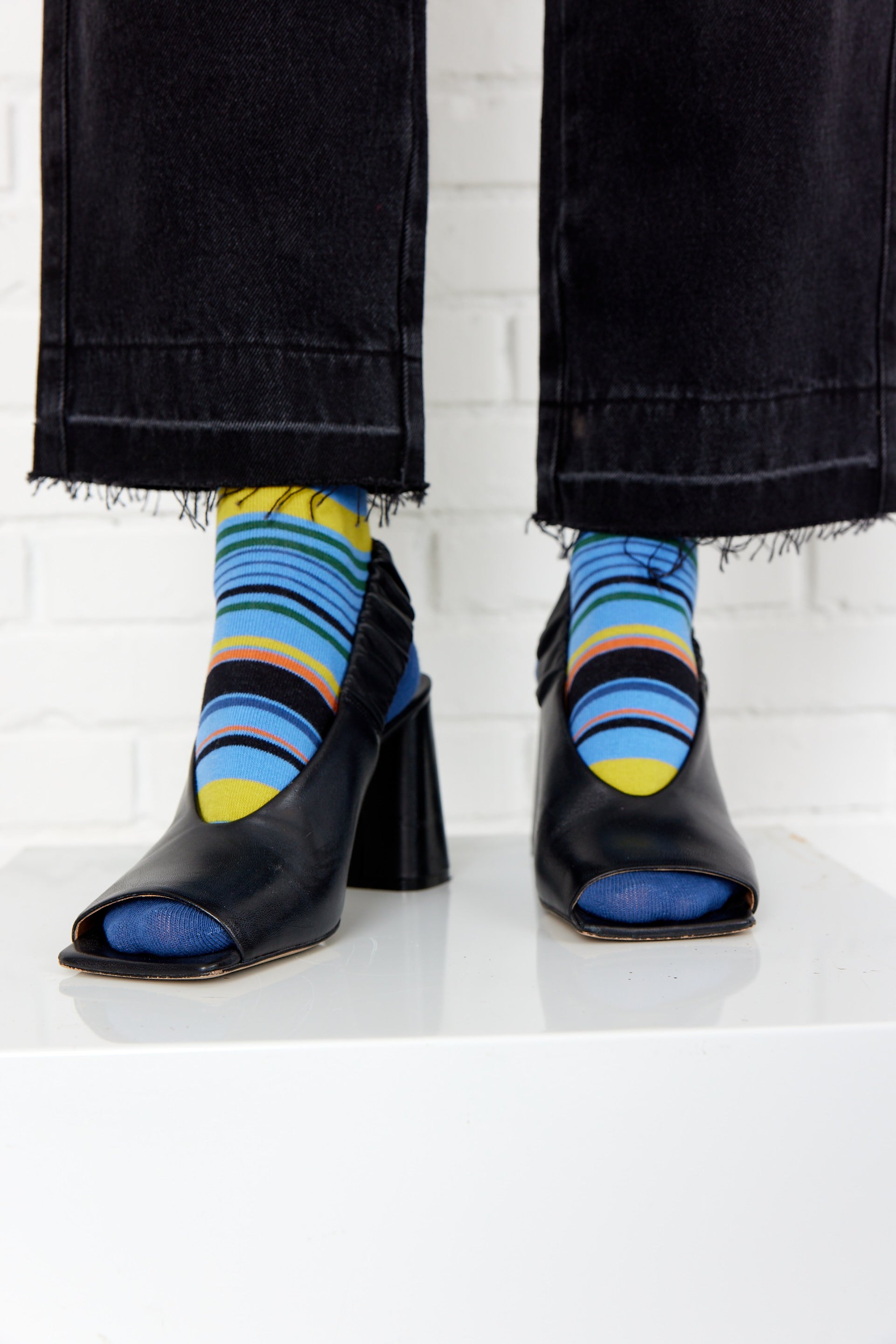 Socks with narrow asymmetrical stripes in a soft cotton quality.