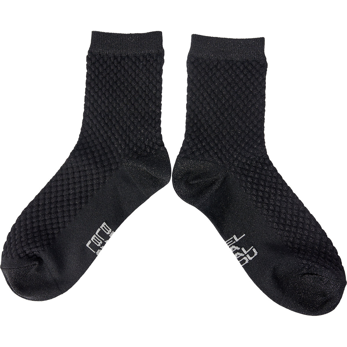 Lurex stockings with small tone-on-tone harlequin pattern.