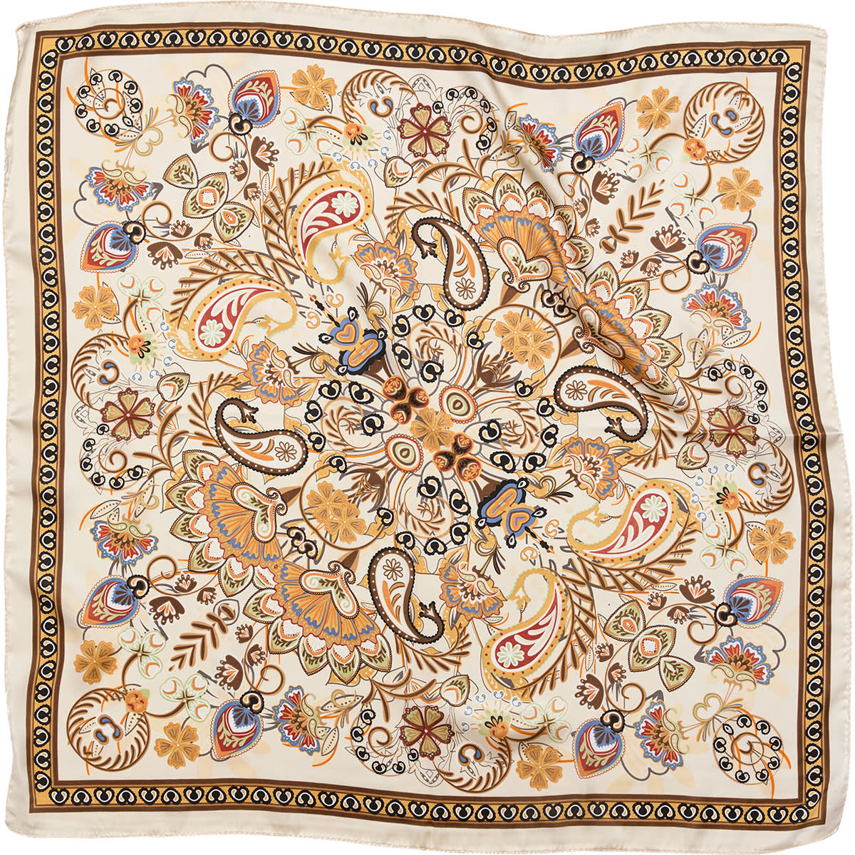 Kvadratisk tørklæde med paisley motiv i gyldne toner og ensfarvet kant.