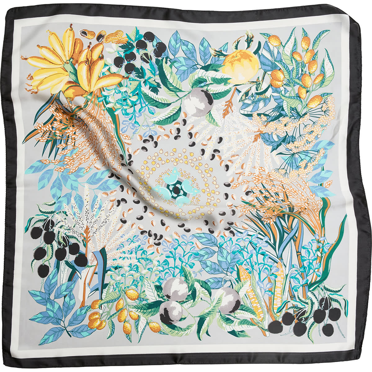 Kvadratisk tørklæde med håndmalet motiv af frugter og ensfarvet kant.