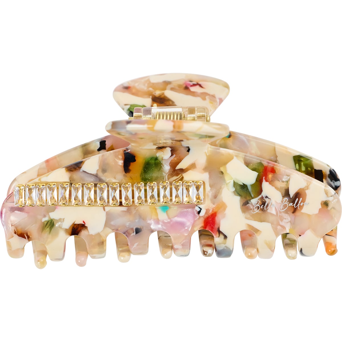Robust hårklämma med rad av rhinsten på båda sidor och silverfärgat logotryck. Tillverkadi miljövänligt Cellulosa Acetat. Sitter tajt och bra i håret.