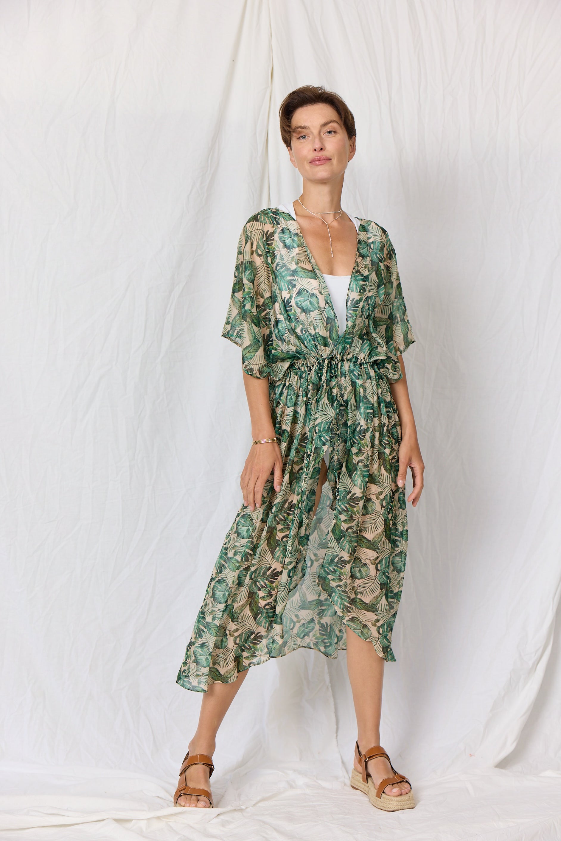 Strand Kaftan med 3/4 långa ärmar och knytband i en fluffig Polyester .