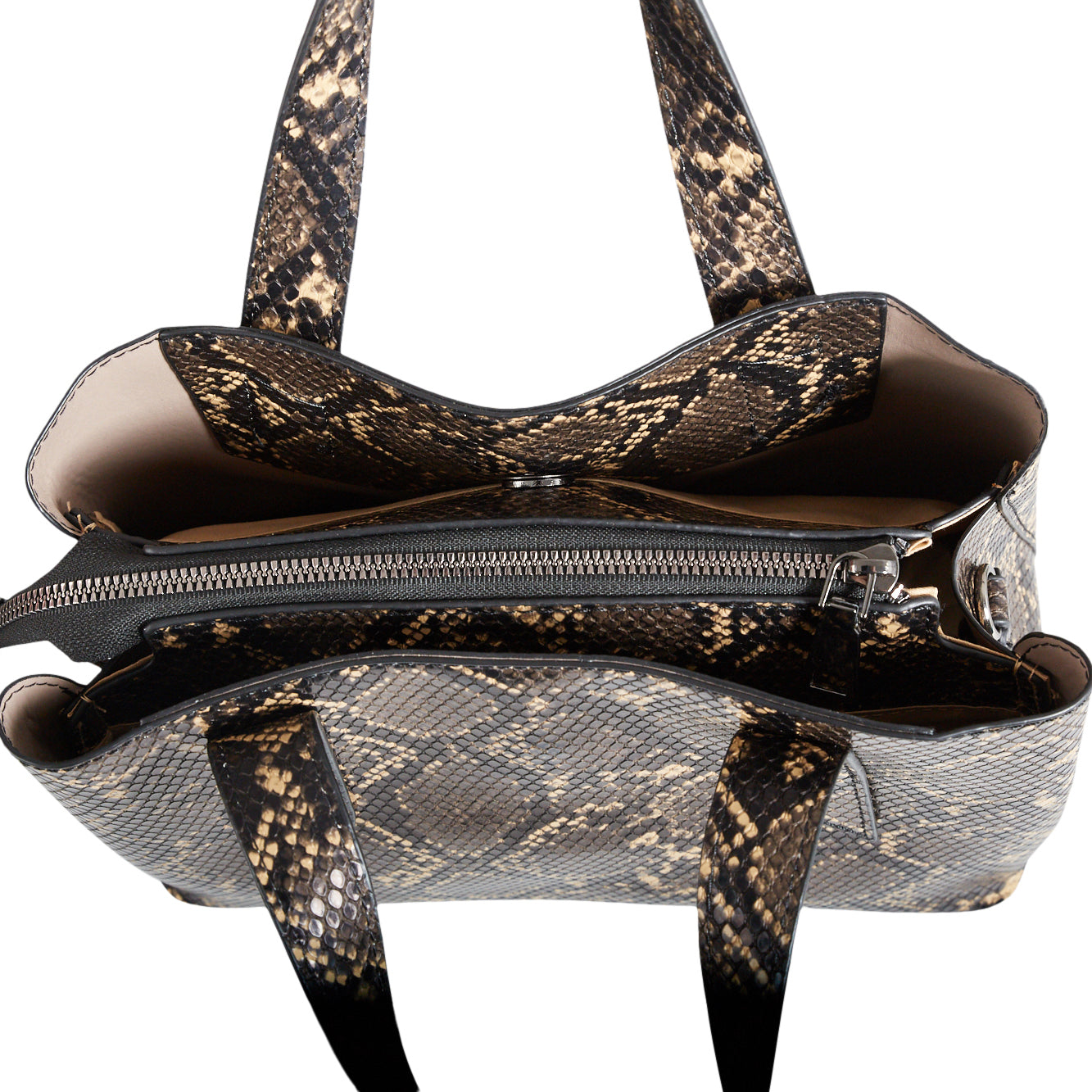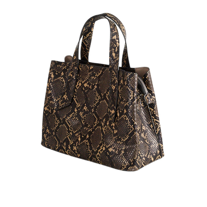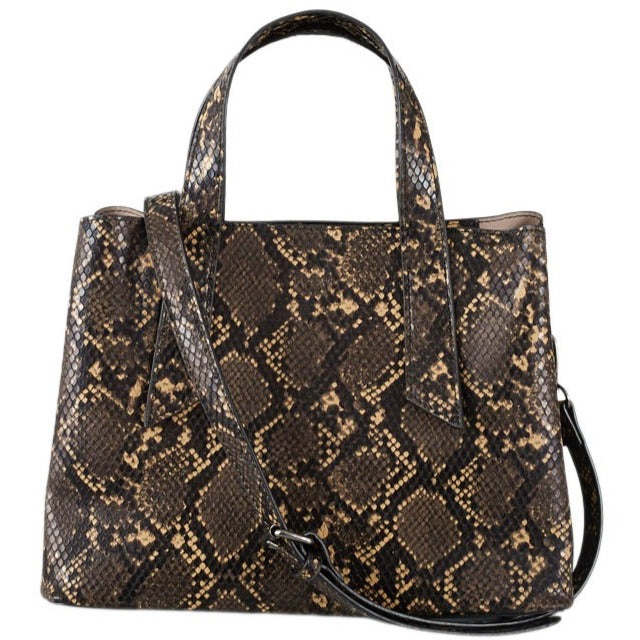 Handväska i ormskinnsimitation med handtag och avtagbar axelrem. 2 externa fack med tryckknappar och 2 invändiga fack med dragkedjor.